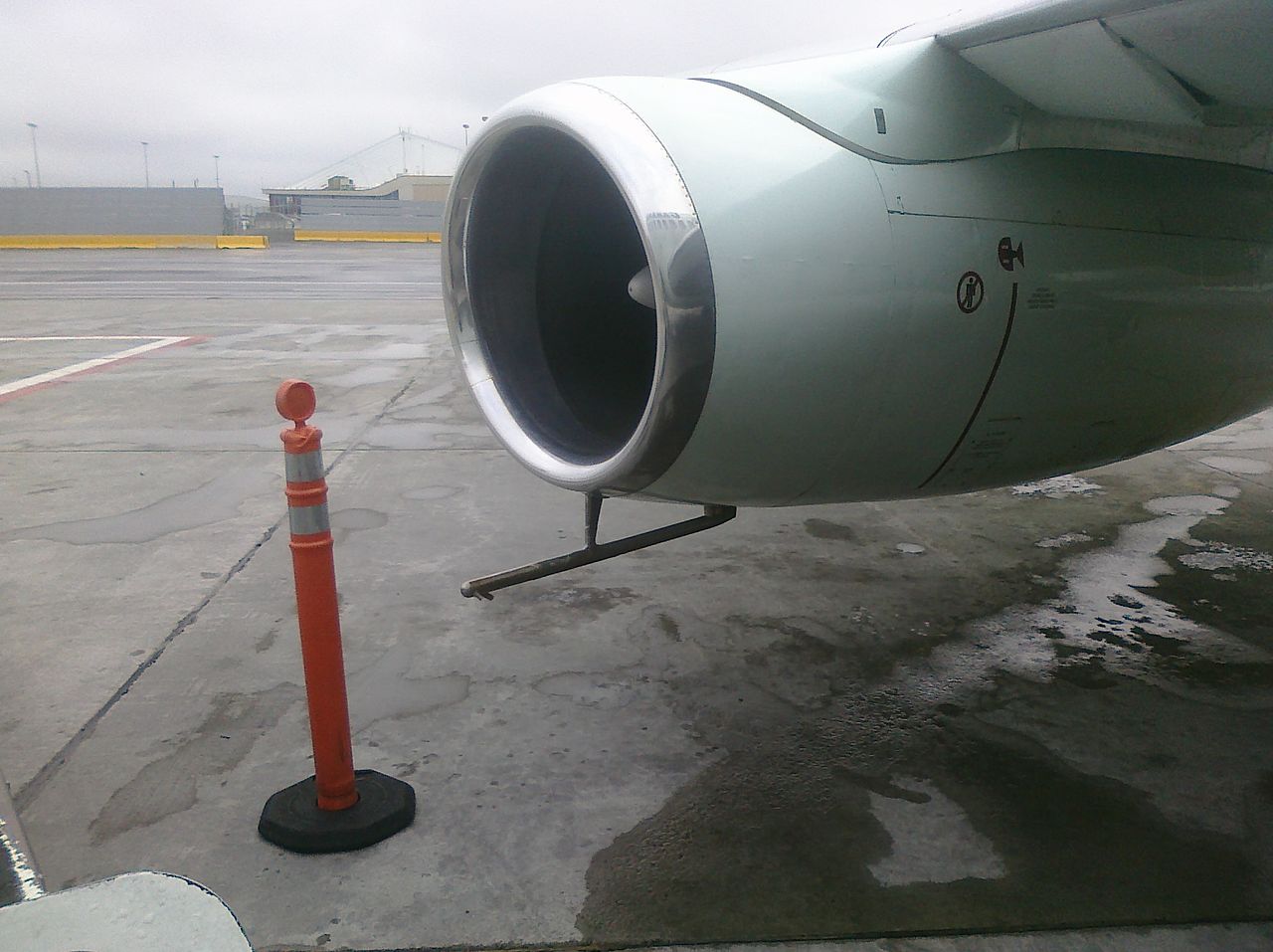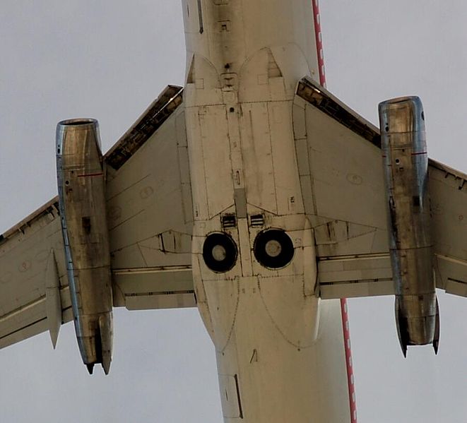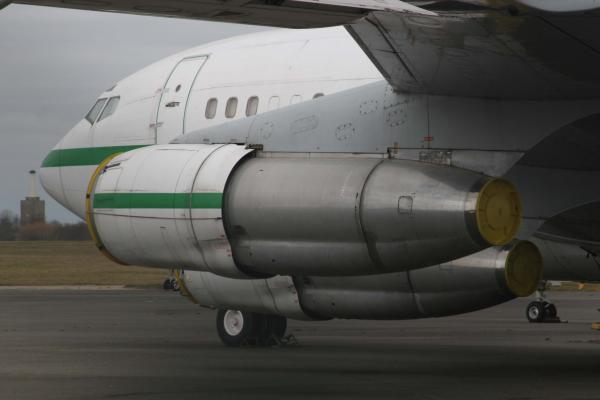A 737-es első hajtóműgenerációja (JT-8 / Pratt&Whitney) közvetlenül a szárnyon. Még ma is üzemelnek ilyen példányok nem szilárd burkolatú pályákról. A szívótorok alatt egy érdekes “extra”, az ún. “vortex dissipator” látható. Ez a hajtóműből a földre nyúló, szívó örvénytölcsért oszlatja szét sűrített levegővel a rosszabb repülőterekhez alakított példányokon.