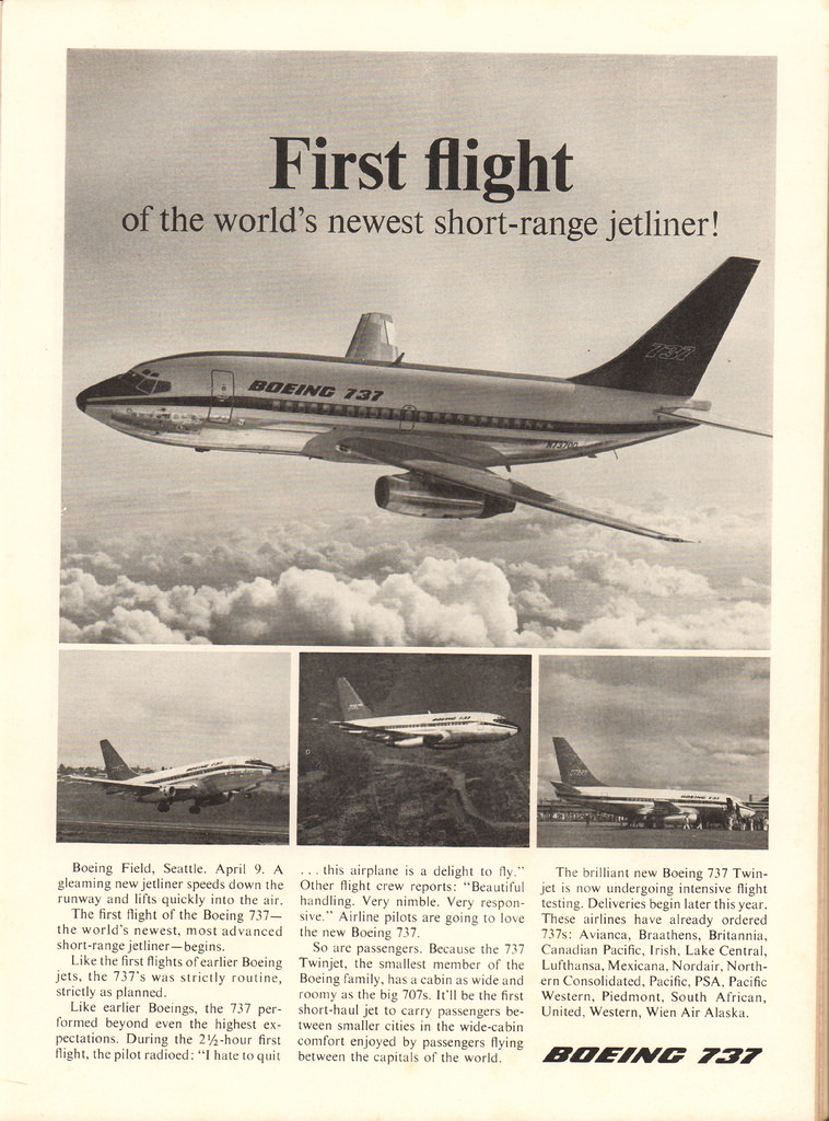 A kategóriateremtő repülőgép 1967 áprilisában kezdte meg a próbarepüléseket a legkisebb konfigurációban, és már ebben az évben meg is kapta az első példányt a Lufthansa. Az egész repülőgép teljes hossza azonban még a Lufthansa által igényelt kis törzshosszabbítással együtt is alig lépte túl a 30 métert. Ebből lett végül a 737-200, majd a kisebb módosításokkal továbbfejlesztett 737-200 ADV melyekből több mint 1100db készült.