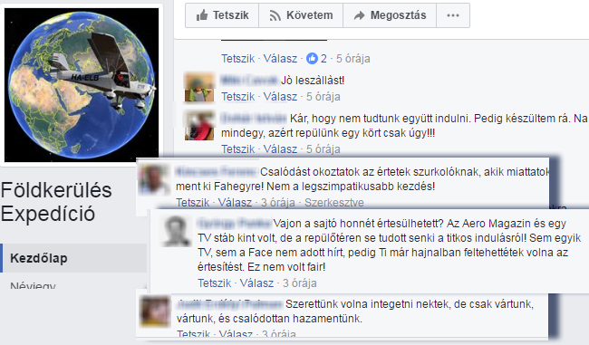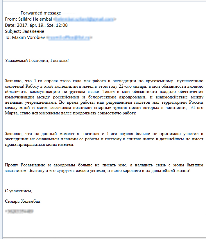 A mai napon bejelentem, hogy a Földkerülés Expedícióban való munkám 2017. Április 1.-én megszűnt! Az expedíció munkáját 2017 január 22.-én kezdtem meg, az orosz kommunikáció lebonyolításával lettem megbízva. Munkám volt az orosz és belorusz repterekkel és hatóságokkal való kommunikáció. A orosz repülési engedély előkészítése során a megbízóm javaslatai alapján, számomra március 31.-re olyan helyzet alakult ki amit erkölcsileg és szakmailag sem tudok tovább felvállalni. Kijelentem, hogy a jelenleg kiadott engedély előkészítésében, munkájában már nem vettem részt, az abban foglaltakat nem ismerem és a nevemre senki nem hivatkozhat 2017. április 1.-je után. Kérem a légügyi hatóságokat és reptereket, hogy ezentúl minden kommunikációt a földkerülés expedíció honlapján szereplő elérhetőségeken tegyék meg! Zoltánnak és feleségének sok sikert kívánok, és sok szerencsét! Üdvözlettel: Helembai Szilárd