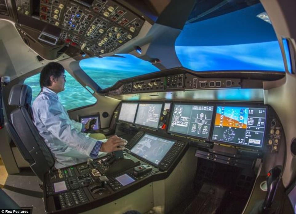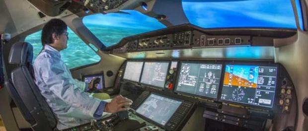 A kormányzás sidestick-es megoldású, a kabin elrendezése pedig szintén a CSeries-hez és a B787-eshez hasonló 5+2 monitoros megoldás: Négy képernyő fedi le a műszerfalat, középen egy keskeny sávban helyezkedik el az ISIS tartalékrendszer. A gázkarok előtt egy osztott multifunkciós képernyő, közvetlenül mellette kétoldalt a kezelőbillentyűzet a 787-eshez hasonlóan helyezkedik el ( a majdani orosz MSz-21-esen is egyébként így lesz ). A sidestick mellett az ablak alatt egy-egy plusz képernyő oldja meg a papírmentes cockpit főbb feladatait.