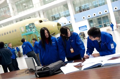 | Fiatalok a Shanghai Aviation (COMAC) ARJ21 gyárcsarnokában |