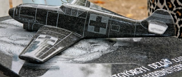 A repülőgép egy II. világháborús, légcsavaros Messerschmitt BF109-es élethű, fekete gránit mása, nagyjából 50x50cm méretű.