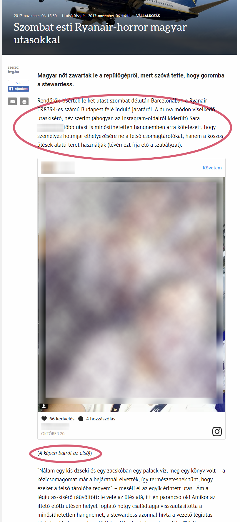 A járaton konfliktusba került Szauer családhoz köthető HVG ennél lényegesen messzebb ment. Egyszerűen kifelejtették a történetből a személyzettel való trágár és sértő kommunikációt, viszont név szerint, a saját közösségi fotójának felhasználásával nyíltan vádolták Sara M. légiutaskísérőt azzal, hogy több utassal is minősíthetetlenül viselkedett, konkrétan üvöltött az édesapával, aki csak egy szatyrot szeretett volna elhelyezni ott ahol egyébként nem szabad. “Ám a légiutas-kísérő ráüvöltött: le vele az ülés alá, itt én parancsolok! “ – írja az egyébként szerzőnév vagy monogram nélkül megjelent cikk.