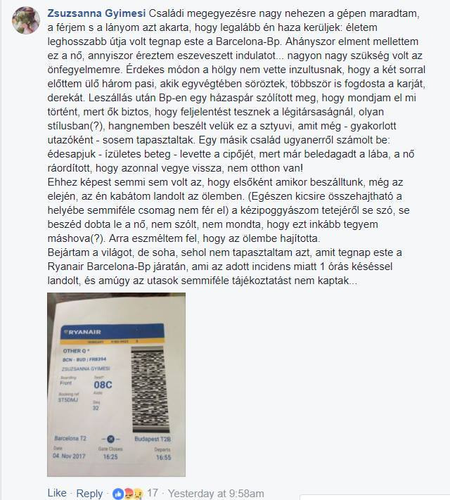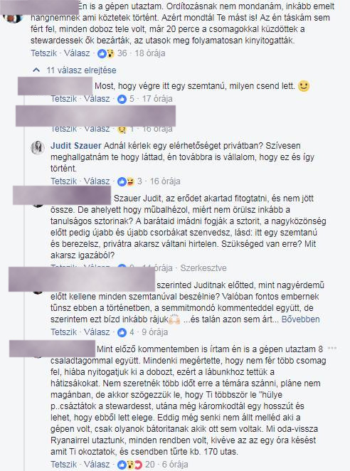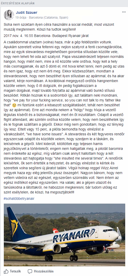 Akadt azért támogató poszt is. Az egyik kommentelő amúgy magyaroschan leköcsögözte az utaskísérőket. Rengetegen szidták a Ryanairt úgy általánosságban, viszont ők nem utaztak a járaton. Szauer Judit édesanyja az ügyben érintett, és szintén a HVG szerzője. Ő így emlékezett a facebookon;