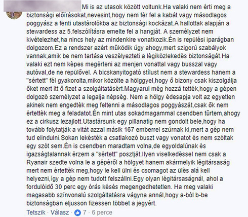 Ugyancsak lehozta a poszt kivonatát a Ripost, amely azért csak vette a fáradságot, hogy a Ryanairt is megkérdezze. Onnan kaptak is választ: “Nem toleráljuk a szabályok megszegését, a zavaró magatartást, és utasaink valamint a személyzet biztonsága és kényelme az első számú szempont számunkra. Ez az ügy most már a helyi hatóságokra tartozik” – írták.” (Hasonló közleményt egyébként ma mi is kaptunk a Ryanair sajtóosztályától.)
