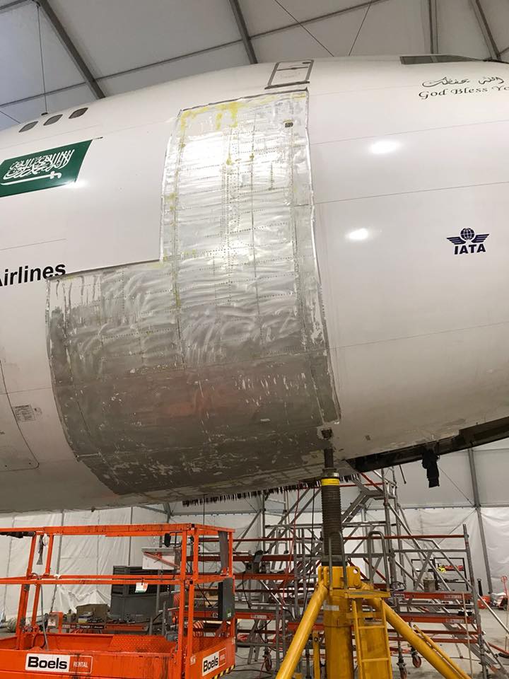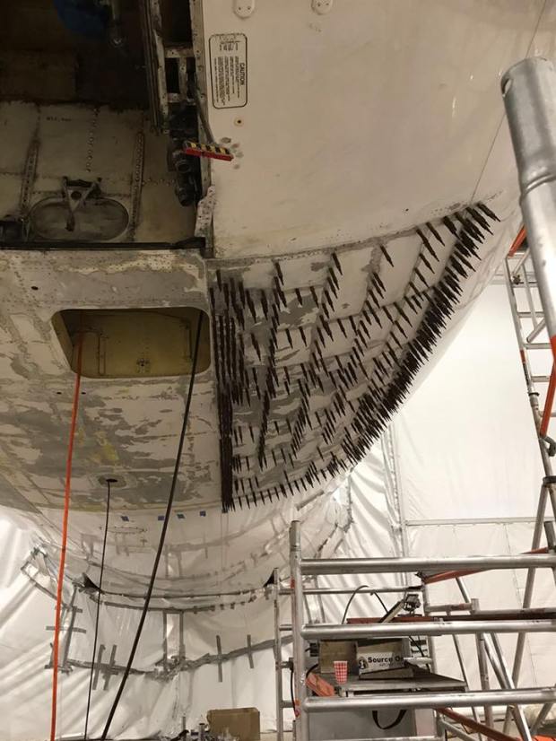 Ezután lehetett csak javítani a félhéj szerkezetet, egészen a felső padlószintig. Gyakorlatilag félkörben megbontották az ún. 41-es törzs-szekciót. (Nagyjából úgy képzeljük el, mintha egy alumínium italosdoboz keresztmetszetét félig átvágnánk, és biztosítani kéne, hogy a két fél ne mozduljon el.) Egyes elemeket ki kellett küldeni a Boeing gyárba, ahol a minta alapján legyártották a pótlást. Az orrfutót közben szintén kiszerelték és javították, részben cserélték.