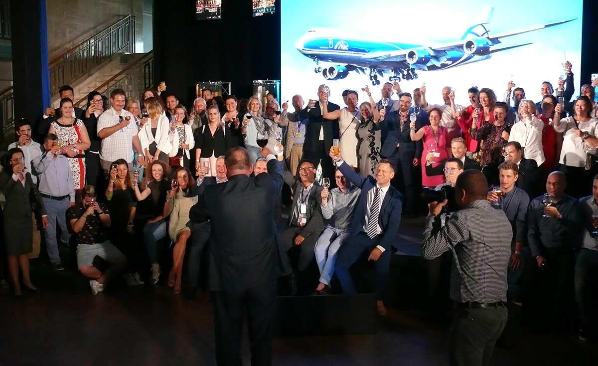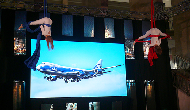 Az egész esemény hátterében folyamatosan jelen volt a flotta gerincét képező 747-8F típus. Selyem-légtornász bemutató a T1 csarnokban az Air Bridge Cargo és az R-Bag színeivel.
