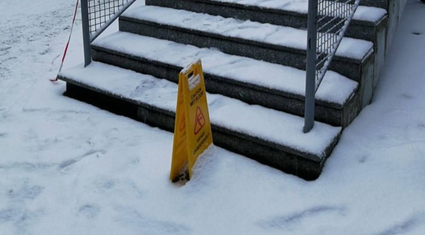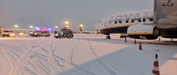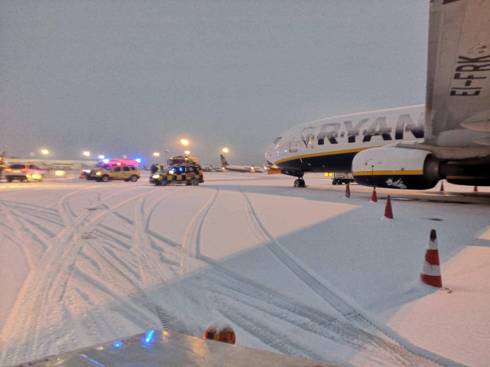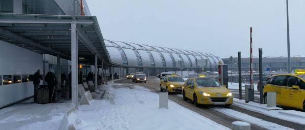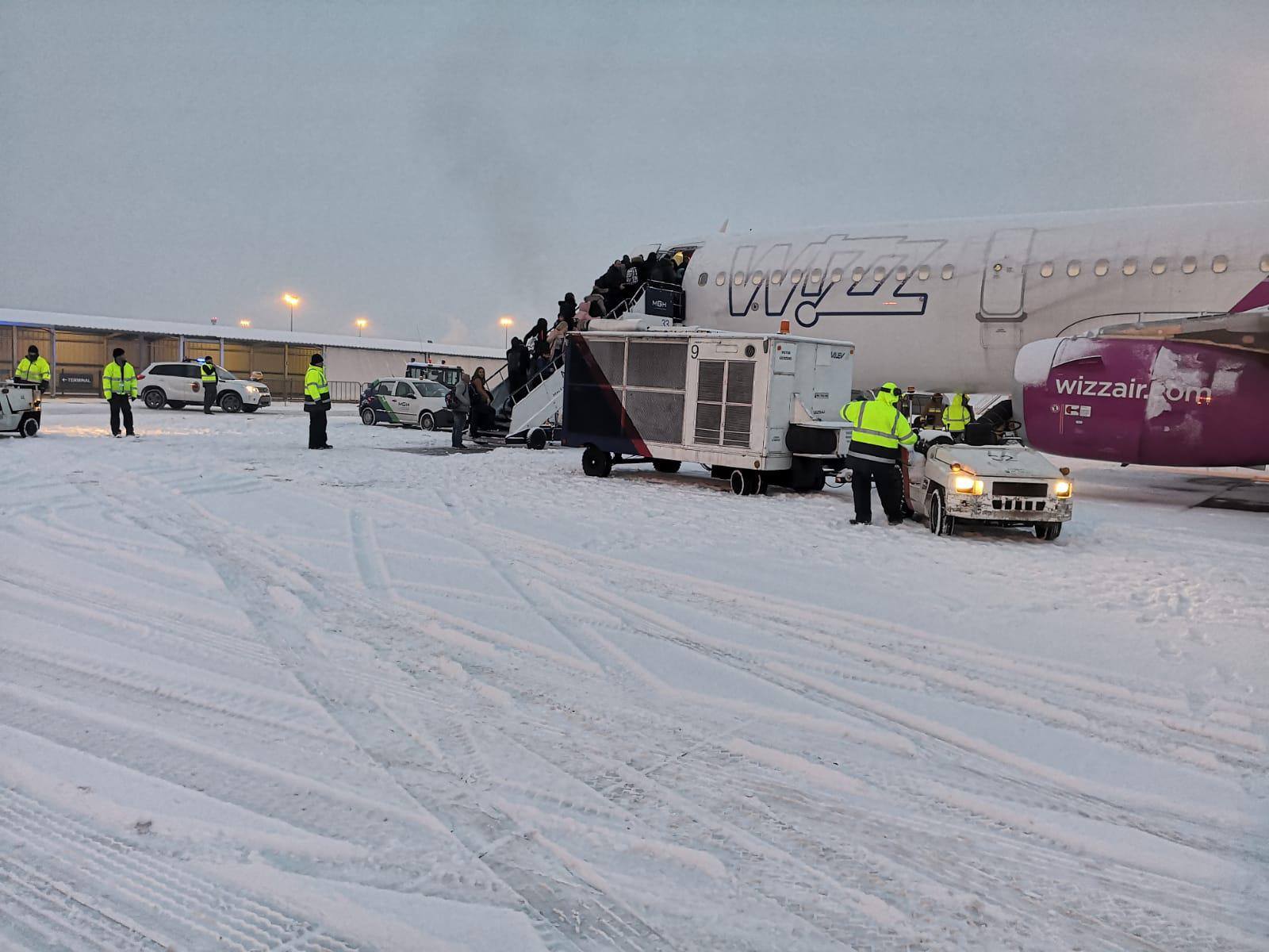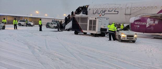 A földön érkező, terminál körül gyalogló és autózó utasok alapvetően az elégtelen vagy meg sem kezdett takarítással találkoztak a havazás után is a szürkületben. Viszont a terminál külső utaslépcsőire a repülőtér alvállalkozója kihelyezte a csúszásveszély táblát. Értékes figyelmesség…