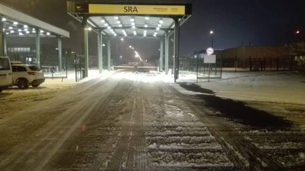 A biztonsági területen kívül sem találkoztak sűrűn a hótakarító gépekkel az ott dolgozók, de erre még visszatérünk később. Az ellenőrző pont melletti gépjármű kijáró viszont így nézett ki a második nap estéjére is – a biztonság jegyében: