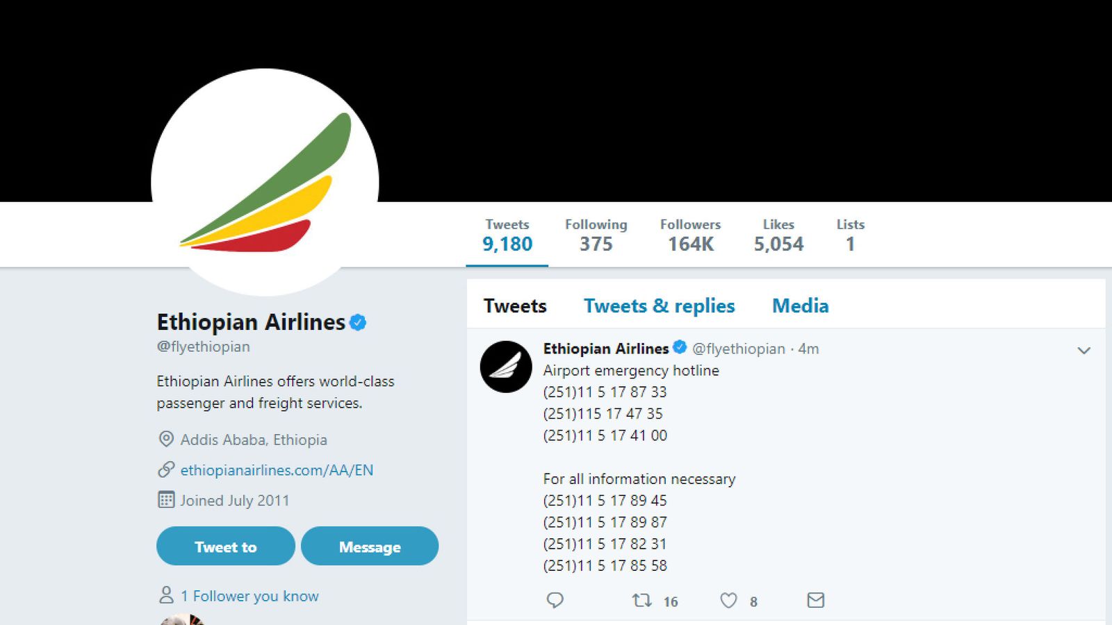 A légitársaság közleményt adott ki, amelyben megerősítik hogy a Kenya fővárosába tartó járatuk Bishoftu közelében szenvedett katasztrófát. Az ET-AVJ jelű repülőgép helyi időben 8:30-kor szállt fel és 8:44-kor már nem volt vele kapcsolat. A mentőakció folyamatban van, a keresést az utaslista (manifeszt) alapján 149+8 fő után kezdték meg. A légitársaság külön tájékoztatóegységet állított fel a hozzátartozók és ismerősök számára.