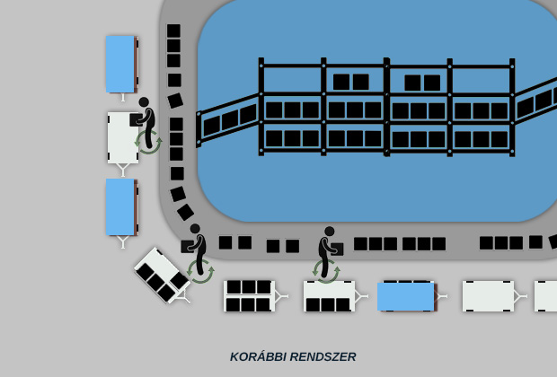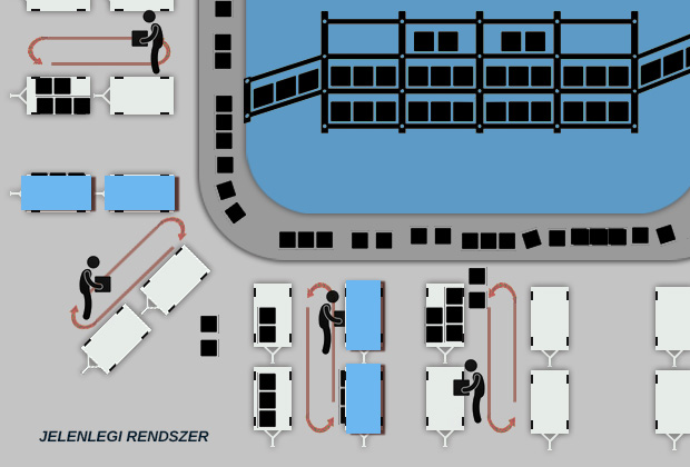 A cikk írása közben bukkantunk az alábbi rendszerre, ahol láthatóan a hatékonyság nem feltétlenül jelent káoszt és túlterhelést. A kocsik ebben a rendszerben rézsútosan állnak a szalag mellé. Több is fér el, nem kell kézzel mozgatni a kocsikat, mert könnyen rá lehet állni a kihúzáshoz. Biztonságos, hatékony és emberséges megoldás. Kétségtelenül nem növeli duplájára az egyetlen szalag kapacitását.