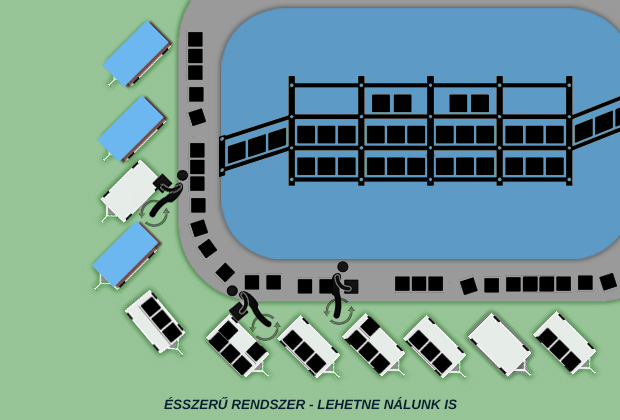 Lehetnének akár ésszerűen felfestett pozíciók, de mostmár dollyk, konténerek és bőröndök kusza halmazában róják a kilométereket a rakodók. A repülőtér levelezése szerint ez most így gördülékenyen működik…
