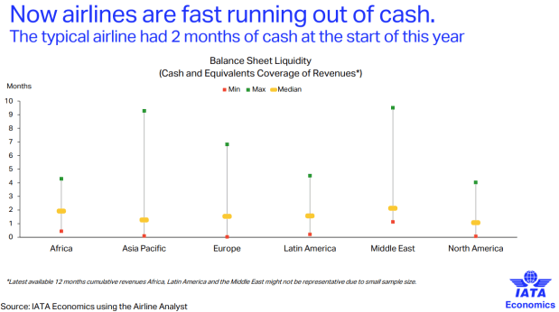 A IATA által bemutatott ábra pontosan jelzi, hogy a tag-légitársaságok átlagosan két hónap alatt kifutnak a készpénzből. Ez a szám Európában valamivel még alacsonyabb.