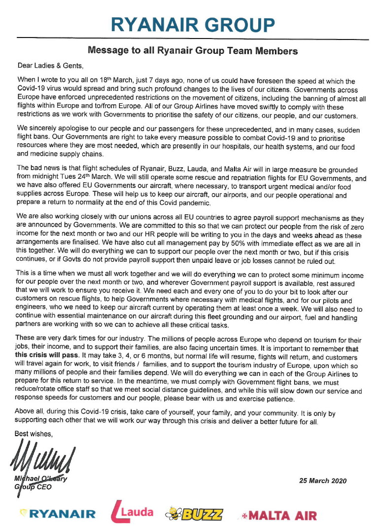 Drámai hangú levélben fordult a gyakorlatilag leálló Ryanair a cégcsoport dolgozóihoz, azonban sem ebből, sem a többi társaság, kiszolgálócég megnyilatkozásaiból, közleményeiből nem derül ki, hogy valójában hány dolgozó marad ténylegesen munka nélkül. A Ryanair a keleti blokkban üzemelő járatait a BUZZ nevű leánycégbe szervezte ki, ahol érdemi védelem nélkül maradnak a dolgozók. Ezzel szemben pl. Németországban az erős szakszervezetek miatt teljesen más pl. a pilóták helyzete. A nyugati és keleti munkavállalók közötti különbségtételt látni a kiszolgáló multik viselkedésében is. Európa tehát ebben sem egységes.