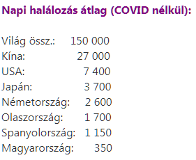 Különösen érdekes a problémát a globális adatkörnyezetbe visszahelyezni, amelyből az ma ki van ragadva. Fellegi Tamás tollából jelent meg a Növekedés.hu oldalon egy infografika gyűjtemény kevéske kommentárral, amely viszont kizárólag a halálozási számokat és halálokokat teszi egymás mellé. Ebből egyetlen számsort emelnénk csak át ide a “hétköznapi” átlag (COVID-tól független) halálozási rátákról. Ez egy jó értelmezési bázist ad a most naponta érkező hírekhez.