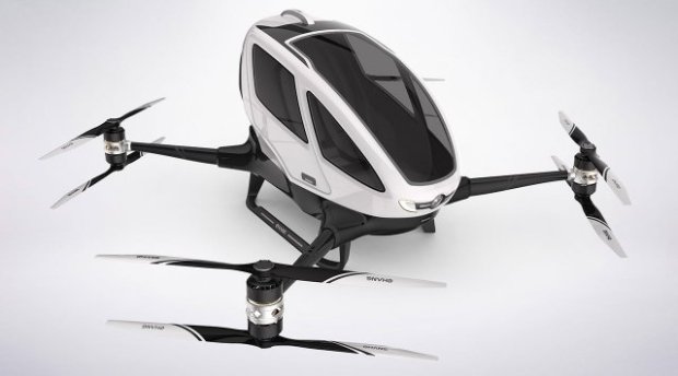 Egy 30-40km-re tervezett kínai multikopter (Ehang). Nagyobb távolságra már drágább, hibrid felépítésű, szárnyas és billenőrotoros vagy csőlégcsavaros légitaxi megoldások vannak a tervezőasztalokon.